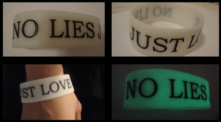 Finally here, NO LIES JUST LOVE one inch wide wristband. Made from silicone, won't easily tear. White wristband with Debossed text and ink injected in black. NOT just cheaply printed on. **GLOWS IN THE DARK! :) Standard size fits all wrists. Order now and help me out with college :)